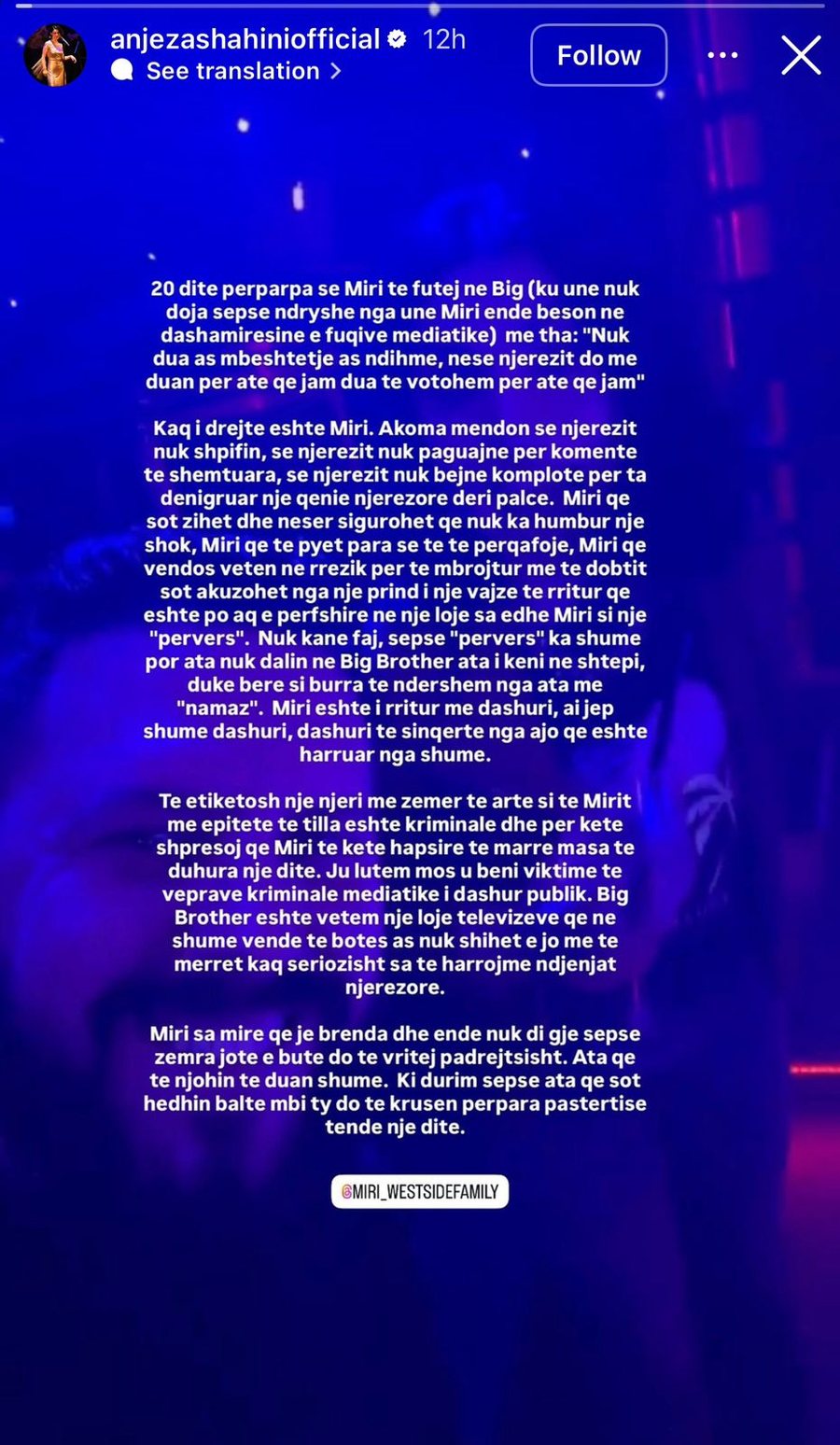 sot zihet dhe nesër sigurohet që nuk ka humbur një shok, Miri që të pyet para se të të përqafojë, Miri që vendos veten në rrezik për të mbrojtur më të dobtit sot akuzohet nga një prind i një vajze të rritur që është po aq e përfshirë në një lojë sa edhe Miri si një “pervers”. Nuk kanë faj, sepse “pervers” ka shumë por ata nuk dalin në Big Brother ata i keni në shtepi, duke bërë si burra të ndershëm nga ata me “namaz”. Miri është i rritur me dashuri, ai jep shumë dashuri, dashuri të sinqertë nga ajo që është harruar nga shumë.