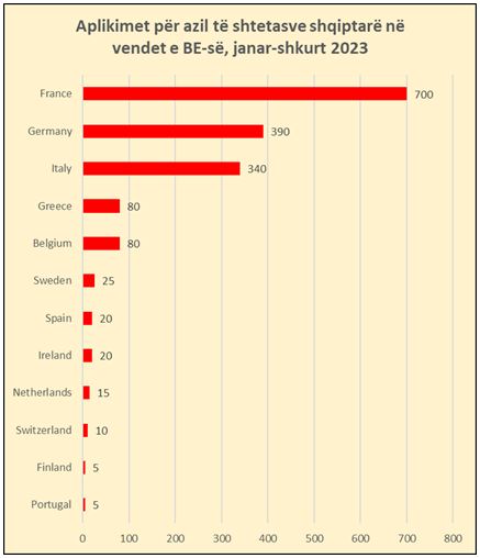 I njëjti burim tregon se, në shkurt 2023, qytetarët e vendeve të mëposhtme kanë paraqitur numrin më të madh të kërkesave për azil në vendet Europiane: