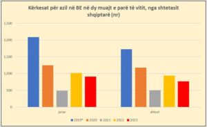 Pas një rritjeje të fortë gjatë dy viteve të fundit, kërkesat për azil nga shtetasit shqiptarë kanë shfaqur shenja ngadalësimi gjatë dy muajve të parë të vitit. Të dhënat e publikuara nga Eurostat bëjnë të ditur se në janar-shkurt u shënuan gjithsej 1,675 kërkesa për azil në një nga vendet e Bashkimit Europian, me një rënie prej 14% në krahasim me të njëjtën periudhë të një viti më parë.