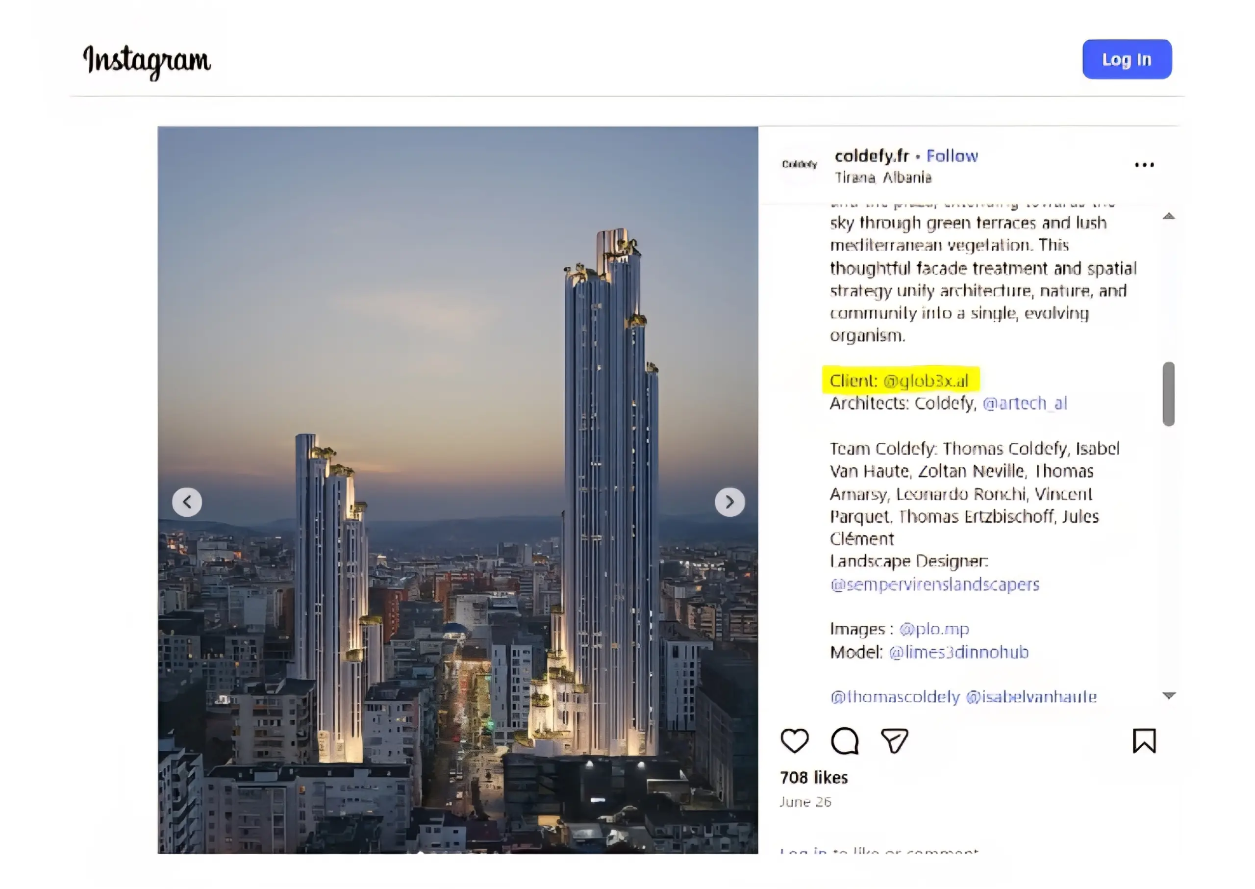 Por, kush do t’a ndërtojë? Firma projektuese “Coldefy” shkruan se klienti është Glob3X. Nëse do të shkosh të faqja e internetit të kësaj kompanie, rezulton se edhe ajo e ka reklamuar projektin në fjalë.