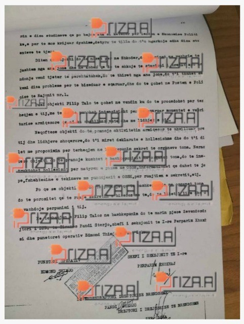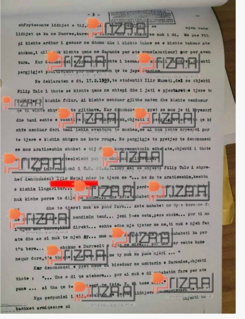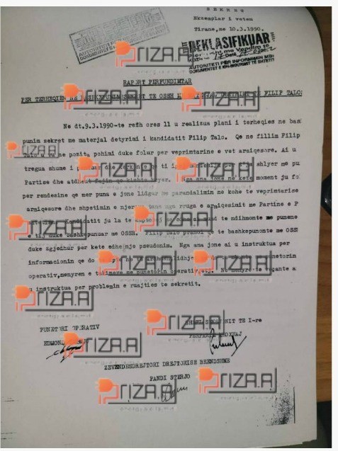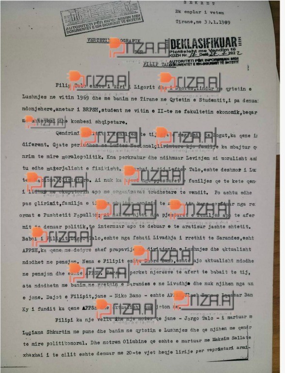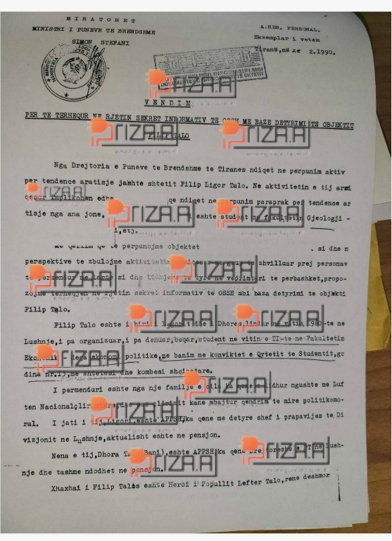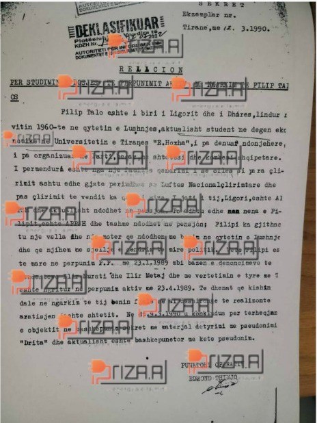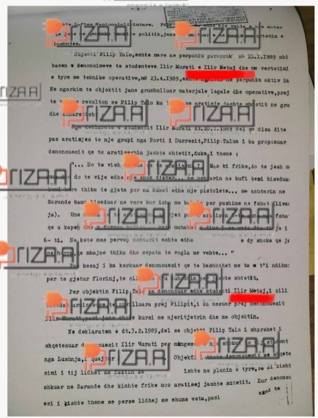 ‘Objekti Filip Talo është marrë në përpunim paraprak në 23.01.1989 mbi besën e denoncimeve të studentëve Ilir Murati e Ilir Metaj dhe me vërtetësinë e tyre me teknikë operative, më 23.04.1989 është ngritur në përpunim aktiv, ku rezulton se Flilip Talo ka tendencë arratisje jashtë shtetit”, shkruhet në dosje.