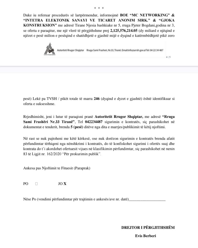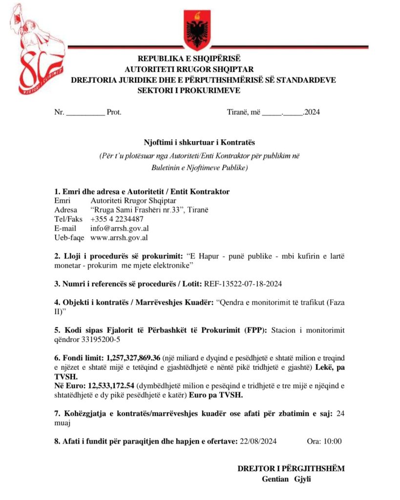 Tenderin e parë me vlerë 21 milionë euro me objekt “Qendra e monitorimit të trafikut (200 km) faza e parë”, për djalin e Kompetentit të Sudes e ka firmosur në prill 2023 pikërisht ish kreu i ARRSH-së, Evis Berberi, në burg me kërkesë të SPAK për afera me tendera, me disa masa sigurie.