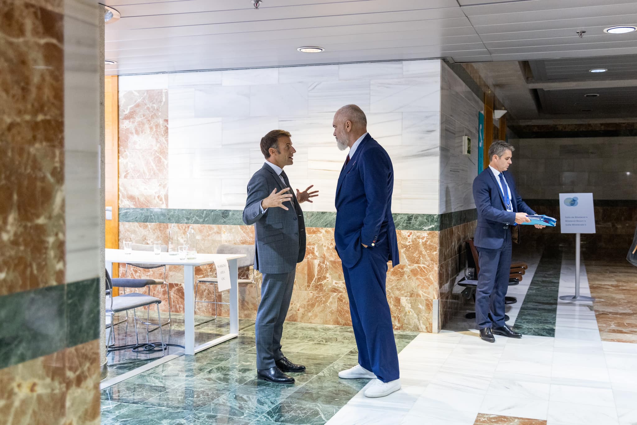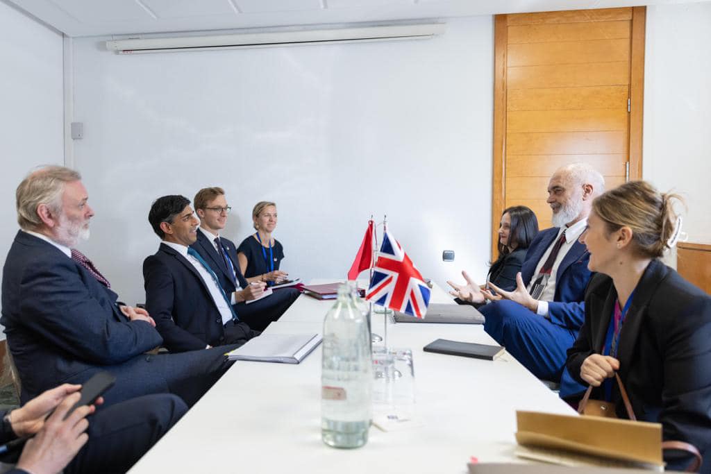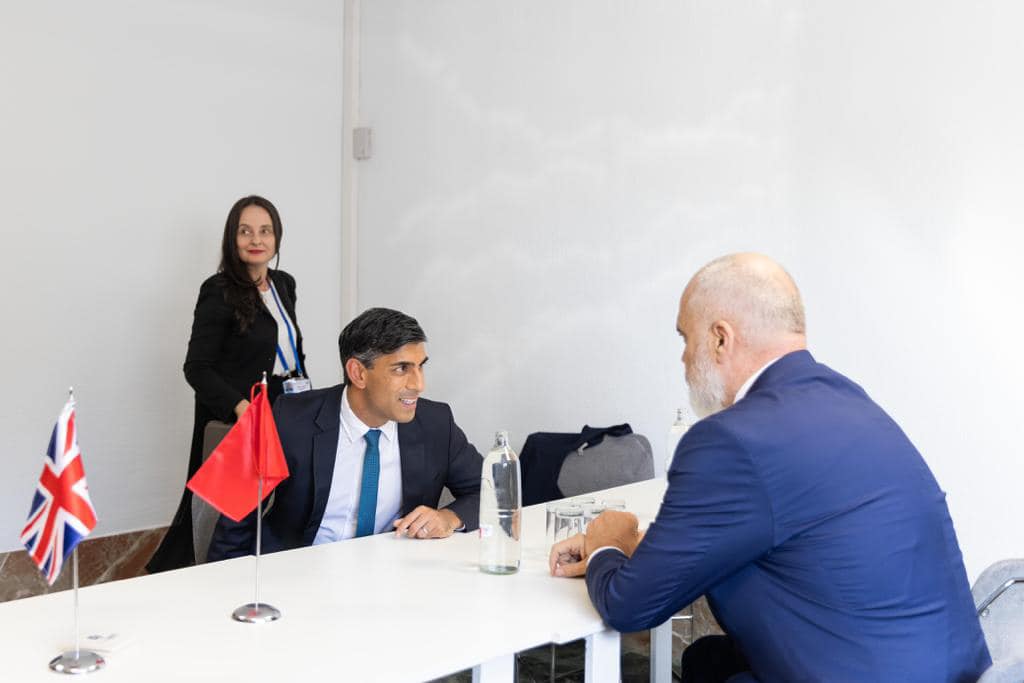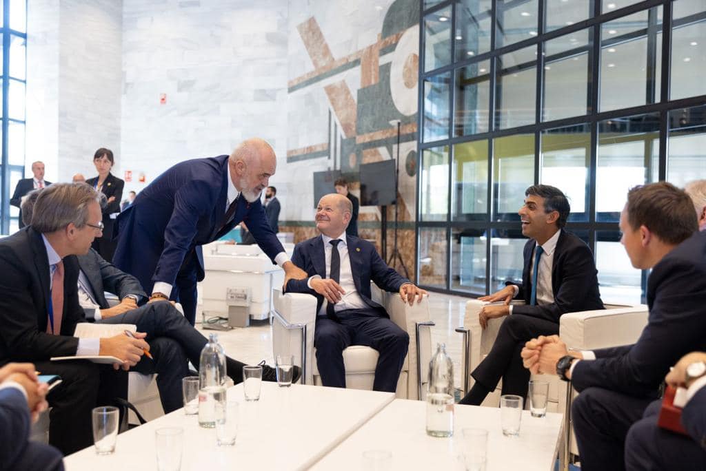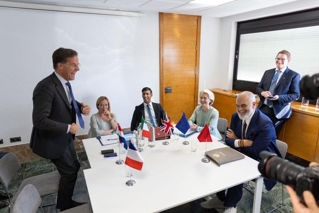 Nga pamjet e shpërndara nga Kryeministria, Rama shihet teksa diskuton me kryeministren e Italisë Giorgia Meloni, Ursula von der Leyen, presidente e Komisionit Europian, kryeministrin e Mbretërisë së Bashkuar Rishi Sunak, Mark Rutte, kryeministër i Hollandës dhe presidentin e Francës Emanuel Macron.