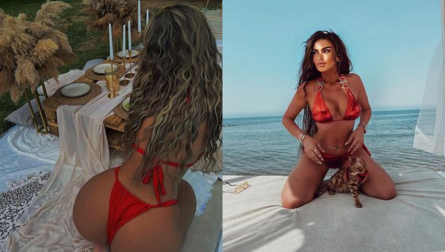 Së fundmi, kërcimtarja seksi ka postuar disa foto nga shezllongu ku shfaqet me bikini ngjyrë të kuqe dhe vë në pah format bombastike. Ajo mban në mes të këmbëve dhe macen e saj, teksa krahas fotove shkruan: “Pse macja ime lëpin dhe më pas më kafshon?”.
