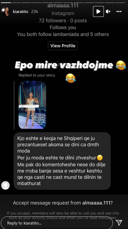 Ajo ka ndarë në Instastory një koment ku shkruhet: “Sa keq je veshur o prezantuese. Për të mos thënë e zhveshur”.