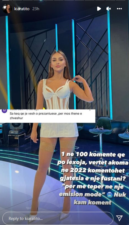 Kiara shkruan: “1 në 100 komente që po lexoja. Vërtetë akoma në 2022 komentohet gjatësia e një fustani? Për më tepër në një emision mode. Nuk kam koment.”