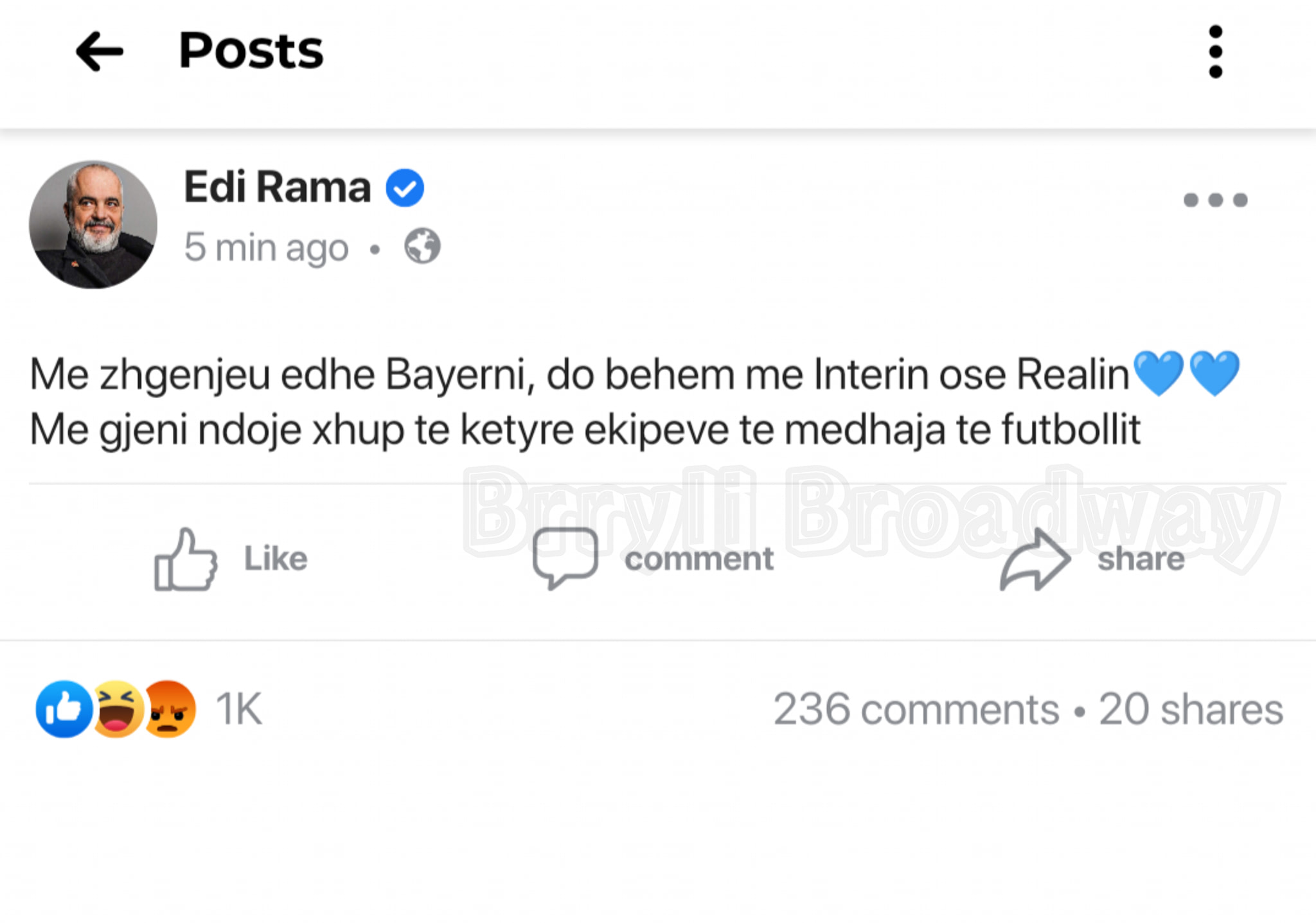 Kur kryeministri Edi Rama u shfaq dy ditë më parë me xhupin e Bajernit të Mynihut, disa portale shkruanin se ai ka ndërruar ekipin dhe nuk është me Juventusin, pas formës së dobët të ekipit nga Torino, ndërsa dhe vetë Rama bëri humor.