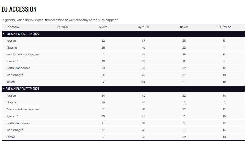 Gati gjysma të anketuarve rreth 42 % nuk presin që vendi të anëtarësohet para vitit 2030, ndërsa 22 % e tyre mendojnë se Shqipëria nuk do të bëhet kurrë pjesë e Unionit.