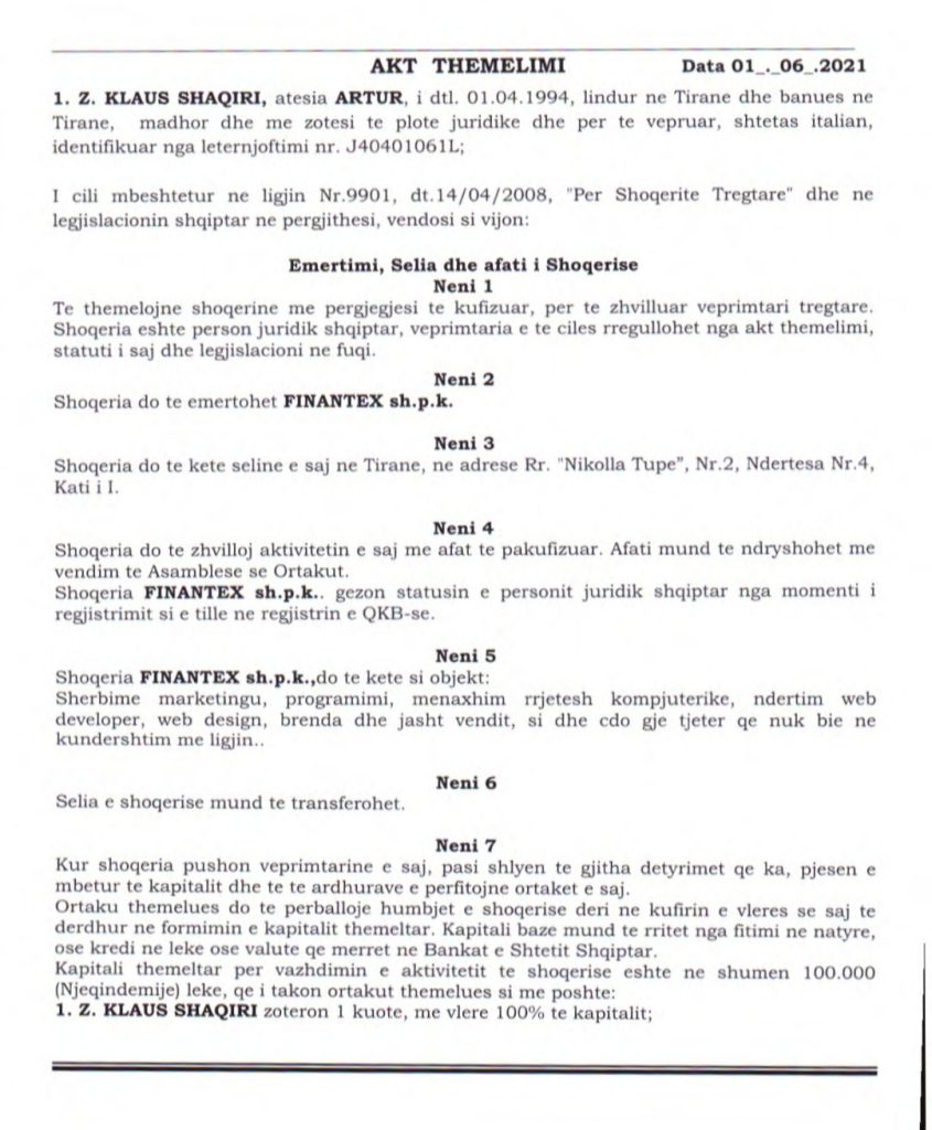 Klaus Shaqiri, përmes kompanisë “Finantex”, komandon disa celula call centerash në Tiranë, duke qarkulluar miliona euro. Shaqiri dyshohet se është prestanome i deputetit të zgjedhur të PD-së, Belind Këlliçi, ndësa siç e konfirmoi operacioni i SPAK, bosi i call centrave e ushtron veprimtarinë kriminale nën mbrotje policore.