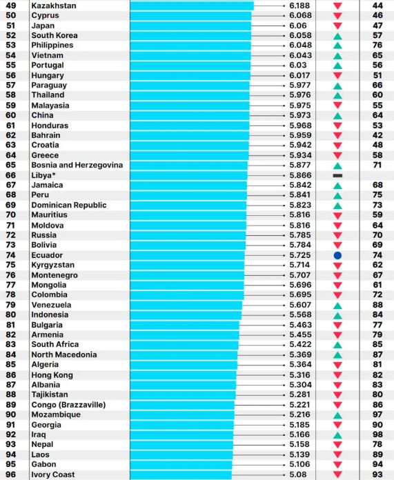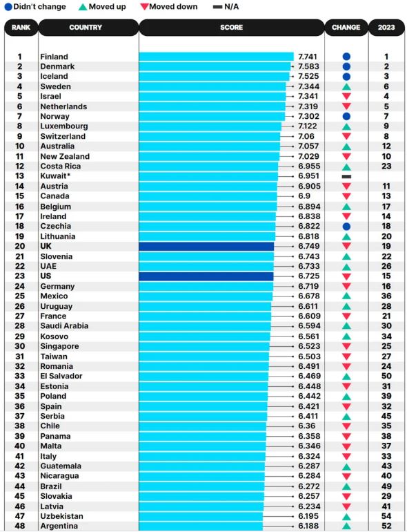 Në rënie në renditje ranë Britania e Madhe, e cila u rendit në vendin e 20-të pas vendeve si Lituania apo Republika Çeke, dhe SHBA-të, të cilat ranë tetë vende në krahasim me vitin 2023 (e 23-ta këtë vit, e 15-ta në 2023).